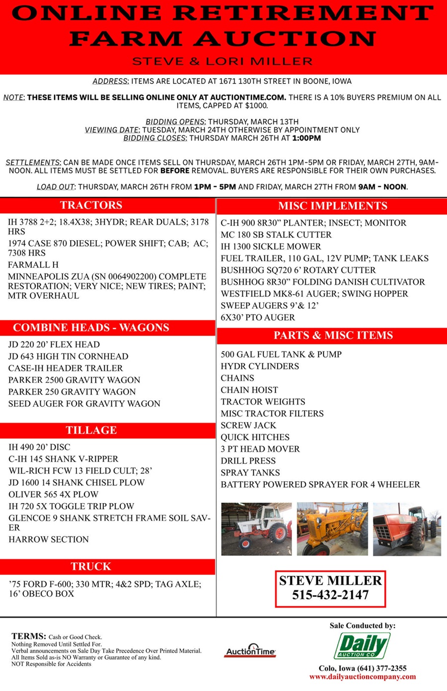 Running-2 rings Saturday with live & internet bidding. Sunday will be pallet row items online only at noon. It’s always a good idea to call if you are coming from a long distance away for a certain piece of equipment to make sure it showed up at the sale lot. Check the website often for updates on equipment arrival. We will update as items come in. Many more consignments are expected. Load out available. All items must be in the sale yard by Wednesday, March 25th @ 5:00PM