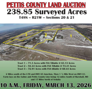 Wheeler Auctions is proud to represent the Arnold’s and present this high-quality Pettis County Farm located just 2 miles off Hwy 65 and bordered on 2 sides by blacktop HWY CC and Hwy RB.
