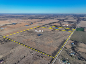 Fri., March 27, 2026 – Leon, KS – live and online 185 acres Butler County real estate auction – 2 tracts – brick house on 24.6 acres with 2 ponds and outbuildings & 160 acres pasture, trees, ponds & blacktop frontage.
